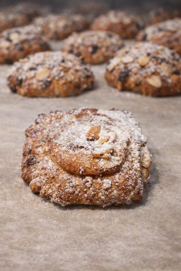 Finas capas de hojaldre crujiente , rellenas de crema pastelera suave de chocolate y pistacho y cubierto de azucar glass .Para pedir 24 horas antes