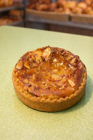 Masa quebrada , crema de almendras con pistacho y albaricoque .
