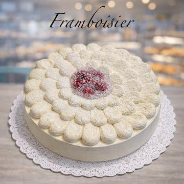 Bizcocho esponjoso , crema mousseline y frambuesas . Fresco , afrutado y delicado . Para pedir 24 horas antes