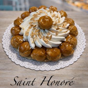Hojaldre relleno de crema ligera , coronado con pequenos profiteroles rellenos y caramelizados dispuestos en forma de corona , todo esta decorado con crema chantilly . Para pedir 24 horas antes
