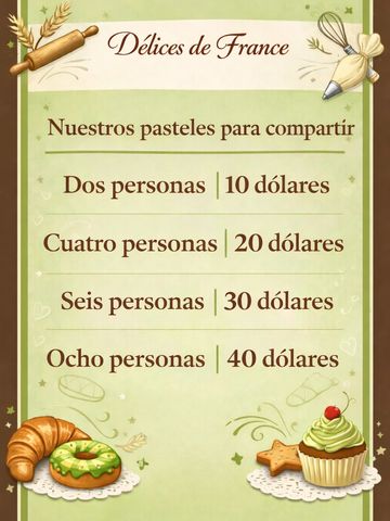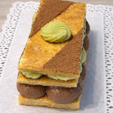 Finas capas de hojaldre crujiente , rellenas de crema pastelera suave de chocolate y pistacho y cubierto de azucar glass .Para pedir 24 horas antes