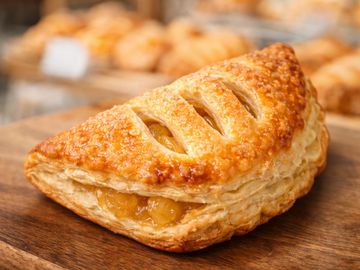 Masa de hojaldre crujiente , rellena de una compota de manzana suave y delicadamente aromatizada