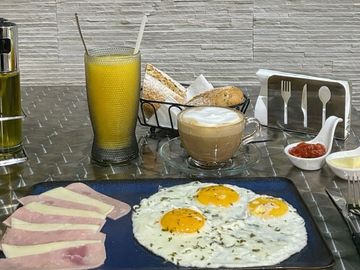 Tortilla , huevos fritos o huevos revueltos con jamon , queso , tomate acompanado de pan , mantequilla ,mermelada , una bebida caliente y un jugo de fruta fresca