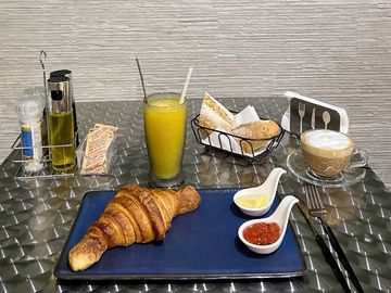 Croissant de mantequilla acompanado de pan , mantequilla ,mermelada , una bebida caliente y un jugo de fruta fresca