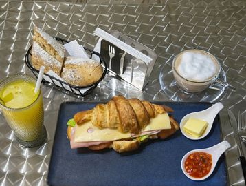 Croissant con jamon , queso , tomates y lechuga acompanado de pan , mantequilla ,mermelada , una bebida caliente y un jugo de fruta fresca