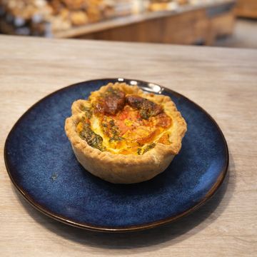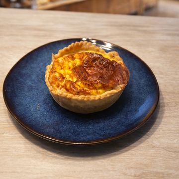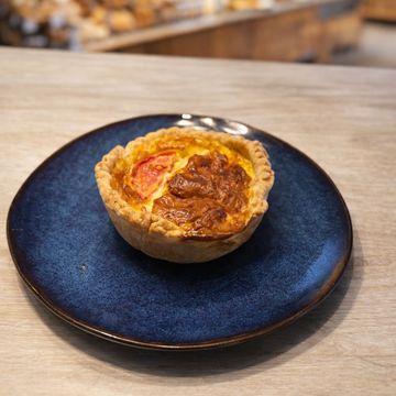 Pequena tarta salada de queso cabra , tomate y huevos