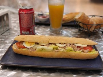 Media baguette con mayonesa , lechuga , tomate , atun y huevo duro