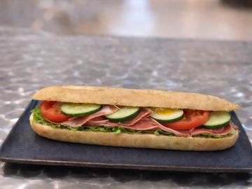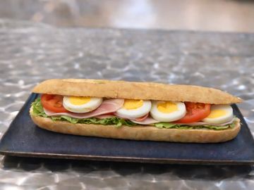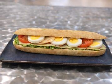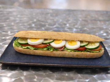 Media baguette con mayonesa , lechuga , tomate , jamon y huevo duro