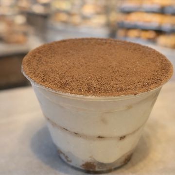 Capas de bizcochos empapados en café , crema de mascarpone suave y cacao en polvo .