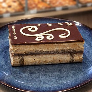 Finas capas de bizcocho joconde empapado en café , crema de mantequilla al café , ganache de chocolate y glaseado de chocolate . Intenso , elegante y refinado .Para pedir 24 horas antes