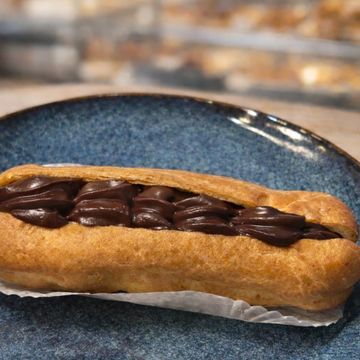 Masa choux ligera , rellena de crema pastalera de chocolate . Delicioso , clasico e irresistible .