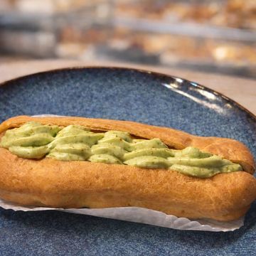 Masa choux ligera , rellena de crema pastalera de pistacho . Delicioso , clasico e irresistible .